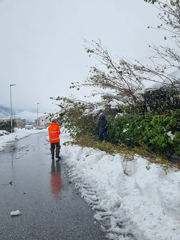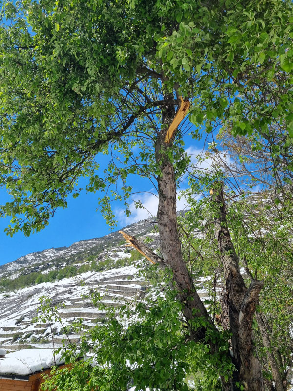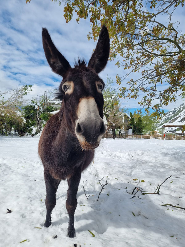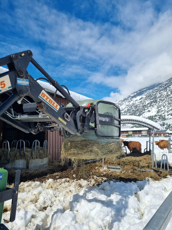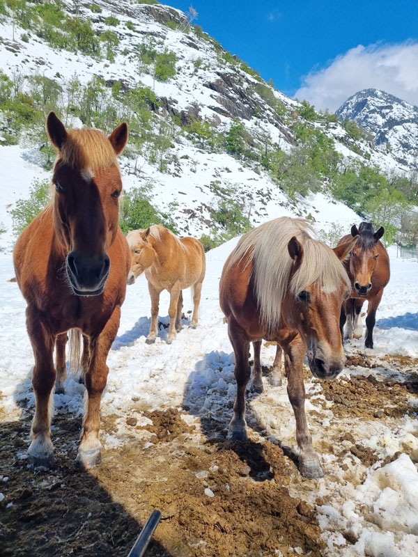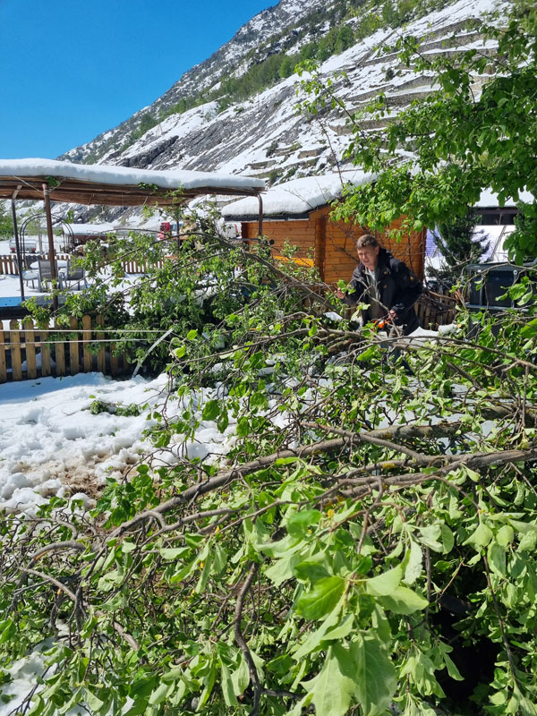 Trotz widriger Umstände wurde in einer ersten Notfallaktion gehandelt und die Zufahrt zum Hof durch das Entfernen umgestürzter Bäume wiederhergestellt. Zwei angemeldete Helfer reisten trotz aller Schwierigkeiten an und packten engagiert mit an. Danke Corina und Olivier für euren unkomplizierten Einsatz! Gemeinsam wurden die Pferde und Rinder versorgt, die Ställe gemistet, die Tiere gefüttert sowie alle Weidezäune kontrolliert und vom Schnee befreit.